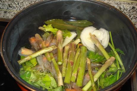 Cabezas del los langostinos, perejil, 3 hojas de laurel, un tallo de apio, 1/2 zanahoria, 1/3 de cebolla, la parte final de los espárragos.