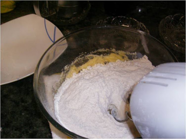 Añadimos la harina y la mezclamos con los ganchos de la batidora hasta que quede todo muy bien integrado, la mezclamos con la manos en la encimera, la dejamos reposar 15 minutos.
