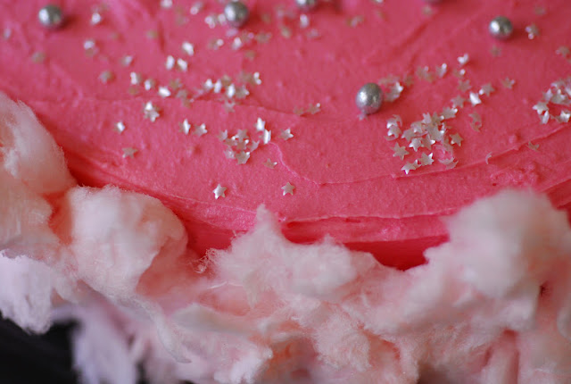 Cubrimos el pastel con la crema rosa ayudándonos con una espátula y lo decoramos con estrellas y bolitas de cereal.