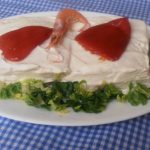 4º) Para servirlo y que fuera una comida completa, yo lo coloqué sobre un fondo de lechuga picadita; lo acompañé de un aliño de pimientos asados con tomate y cebolla roja; y lo adorné con all i oli caserito.