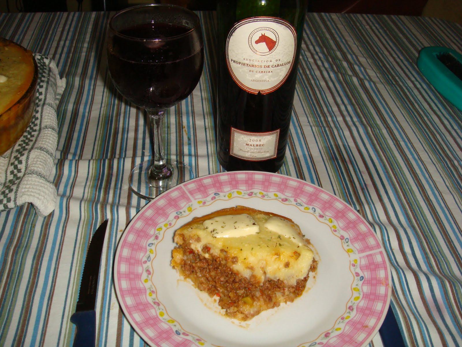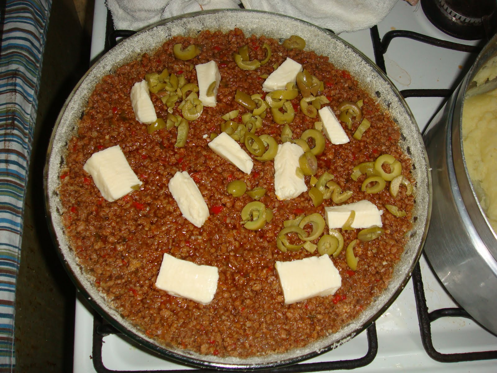 Ingredientes: (6 porciones): 1 kg de carne picada, 2 kg de papas, 2 cebollas medianas, 1 morrón rojo, 1 morrón verde, 1 diente de ajo, 1/2 kg de tomate, 100 gr aceitunas verdes, 100 gr queso cremoso, 1 huevo, 2 cucharadas aceite, 1/2 cucharada pimentón, 50 gr queso rallado, 1 caldo en cubo de carne, leche cantidad necesaria, manteca cantidad necesaria, 1 cucharada de orégano, pan rallado cantidad necesaria, sal y pimienta a gusto.