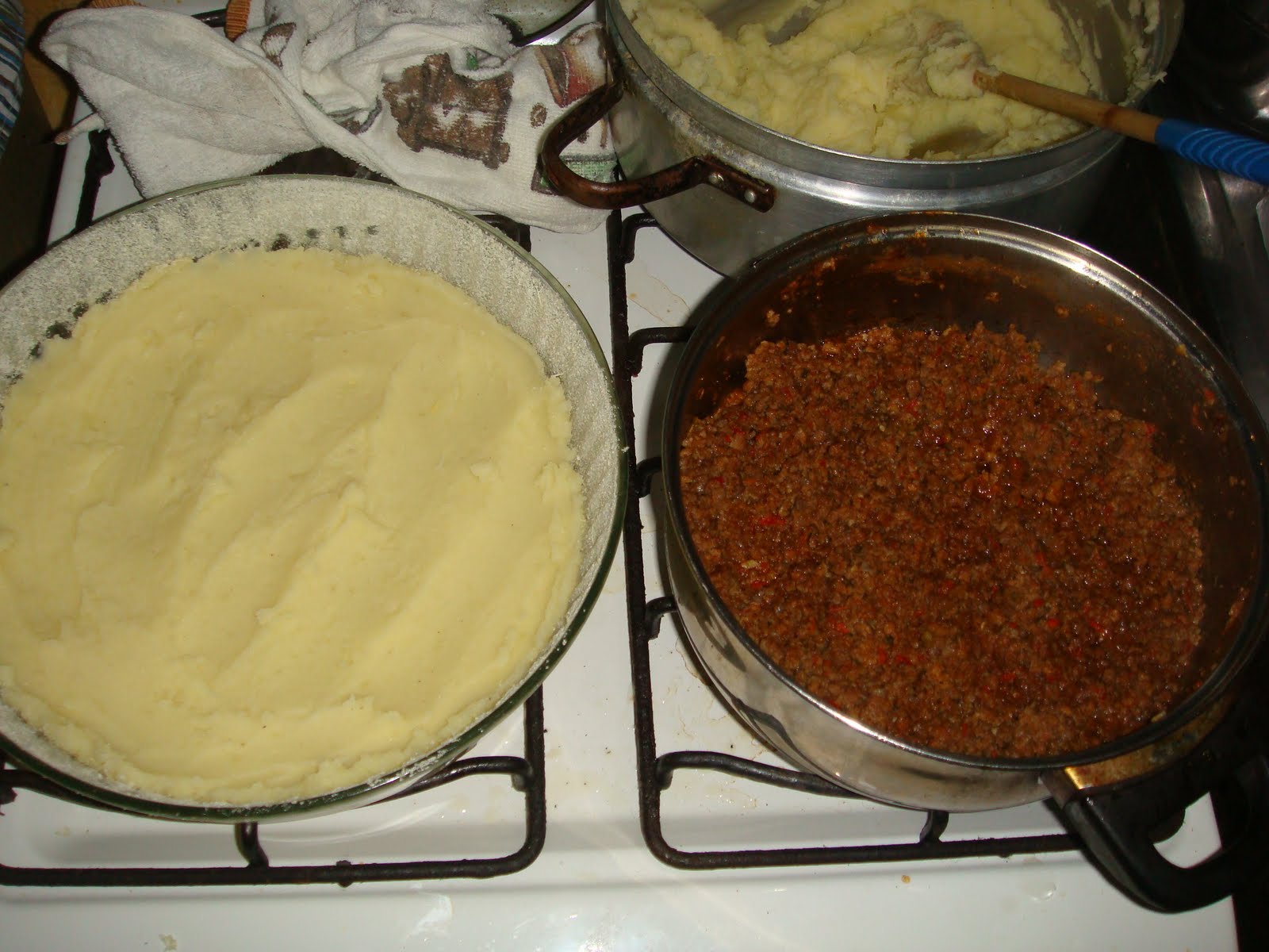 En una cacerola aparte preparar el puré de papas con leche, manteca, queso rallado y nuez moscada si es de su agrado. Debe tener una consistencia mas bien espesa antes que líquida, de lo contrario se desarmará al momento de servir. Para que quede más firme se puede añadir al puré una yema de un huevo. Reservar para armar el pastel.