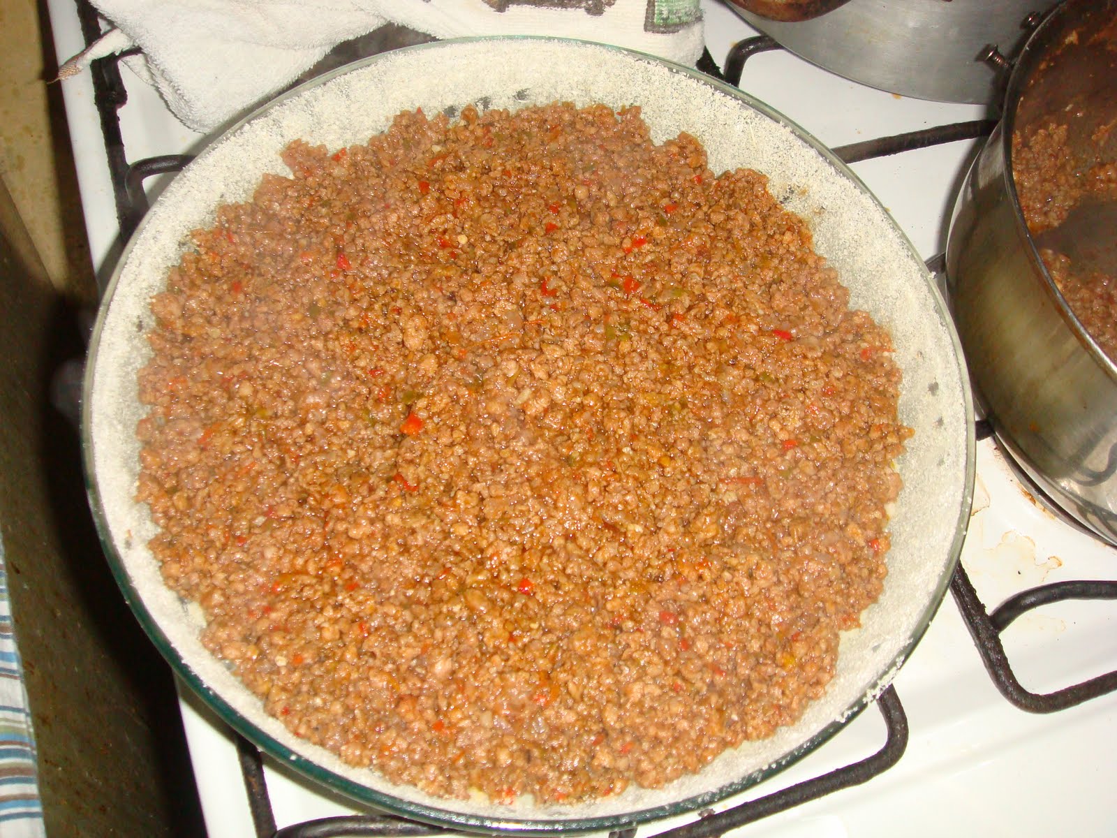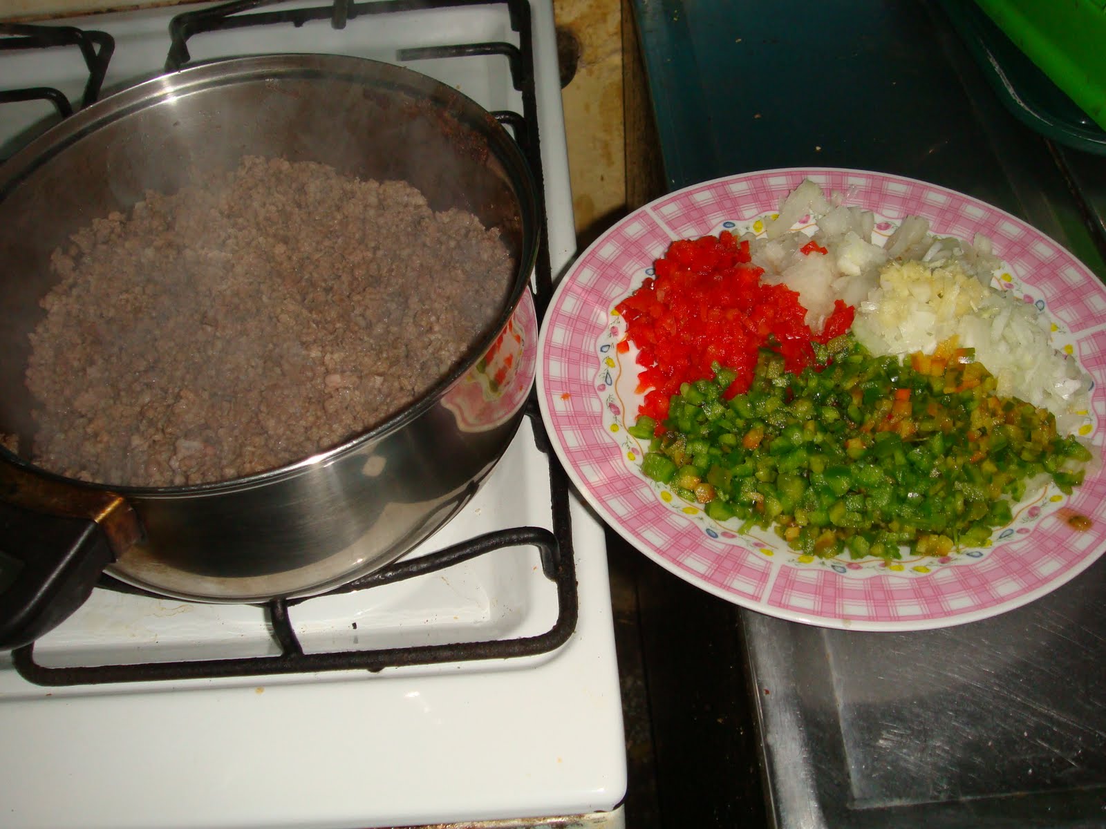 Preparación: Rehogar la carne picada, aproximadamente 10 minutos, en una olla con dos cucharadas de aceite hasta que no queden rastros de sangre.