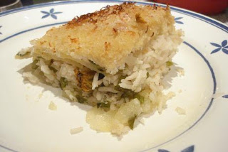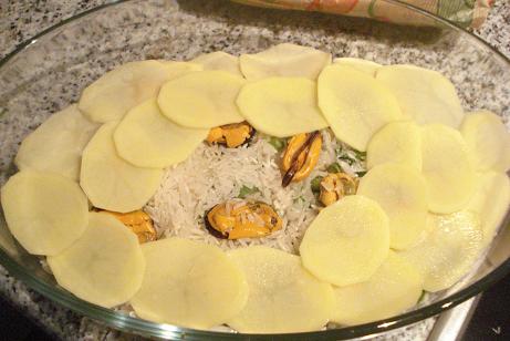 3 patatas, 1 lata de mejillones al natural, 100 gr. de espárragos trigueros, 120 gr. de arroz largo, 1/2 cebolla, 1 diente de ajo, parmesano rallado, pan rallado, caldo de pescado, aceite, sal, albahaca y perejil.