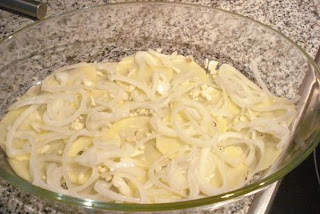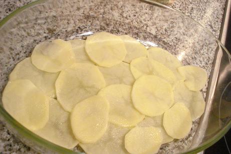 Untar una bandeja de horno con un poco de aceite y disponer las patatas cortadas en rodajas finas (usé una mandolina, el corte más fino).