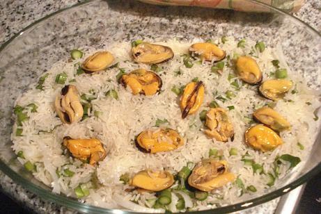 Incorporar los espárragos cortados en rodajitas, 3 puñados de arroz (mejor el arroz largo, crece menos) y los mejillones con su agua.