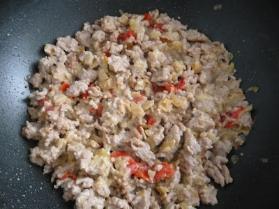 Poner la cebolla en el wok y dorar, luego añadir la carne picada y seguir pochando y dorando, unos pocos pimientos rojos (de bote) y por ultimo un chorrito de leche evaporada para darle suavidad.