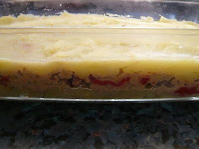 Ponemos ahora en una fuente de horno una capa del pure de calabacin y la patata, luego echar toda la carne extendiendo bien.