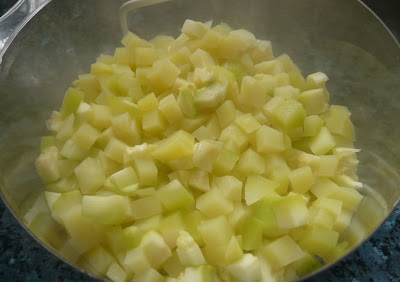 Cortar la patatita y el calabacin pelado en cuadraditos y ponerlo a cocer (yo lo hice en mi vaporera), una vez listo escurrir bien y machacar con un tenedor.