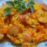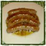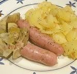 Las salchichas las cortamos en trozos y las doramos en una sartén aparte. Le quitamos la grasa sobrante en un papel absorbente y las añadimos al guiso unos cinco minutos antes de que estén hechas las patatas. Antes de servir espolvorea un poco de cebollino.