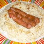 8 salchichas de carne – 1 kg de patatas – 1 cebolla medina – 2 tomates – 1 diente de ajo – 1 litro de caldo de ave – 1 cucharada de cebollino – aceite y sal.