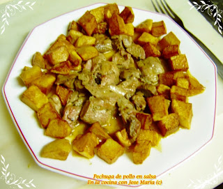 En la sartén que teníamos de sofreír el pollo,escurrimos el aceite, y vertemos en ella la salsa del cazo, añadimos los recortes de pechuga y removemos lo tenemos hasta que veamos que el pollo se ha cocido por todos los sitios,añadimos una cucharada de mantequilla para que espese, cuando esté desecha retiramos y servimos,podemos acompañar de unas patatas fritas.