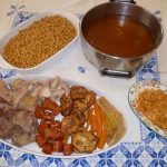 Reservar las carnes y en el agua de su cocción  poner los garbanzos y cocer entre 18 y 20 minutos (comprobar si están bien blandos). Añadirlos al sofrito y cubrir todo justo al ras con agua de cocción.