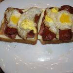 Poner en el lado más anchodel triángulo una loncha de queso, la salchicha, beicon, mostaza, ketchup y enrollarlo hacia el borde más delgado, pintar con huevo batido y ponerlo al horno a 180º aproximádamente 15m.