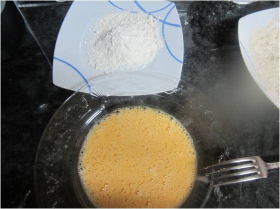Los filetes de merluza los pasamos por harina y huevo y los freímos en aceite de oliva , según los sacamos de la sartén los dejamos en un plato con papel de cocina para quitarles el aceite sobrante.