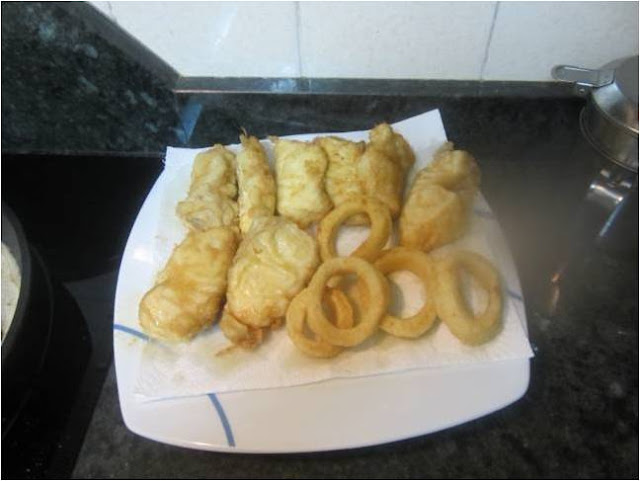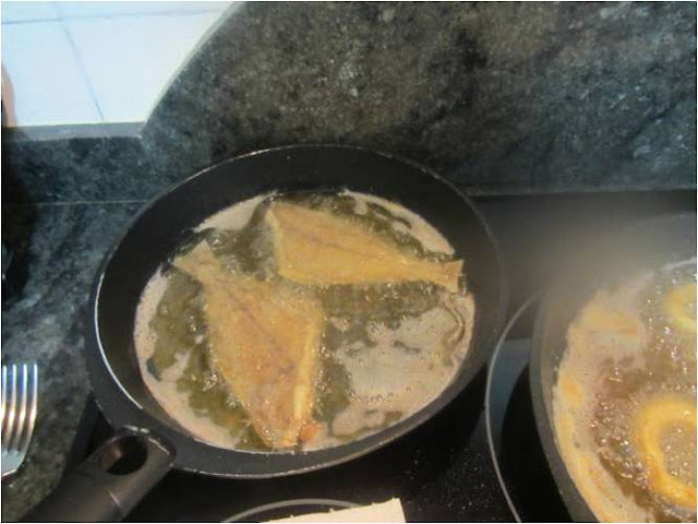 Freímos los calamares y en otra sartén vamos friendo los gallos rebozados en harina de freír con un poco de harina de garbanzos.