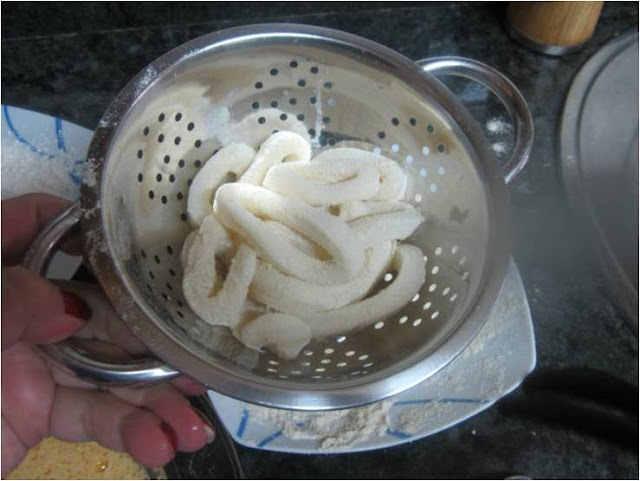 Pasamos por harina las anillas de calamar y las quitamos el harina sobrante en un colador.