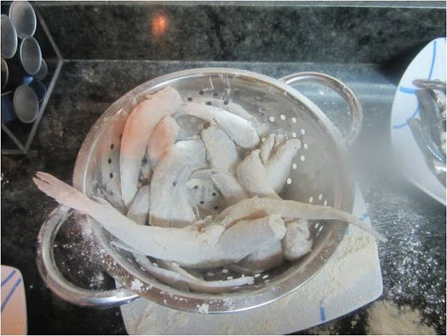 Las pijotas una vez bien rebozadas en harina por todos los lados las ponemos en el colador para sacudirlas y quitarles la harina sobrante.