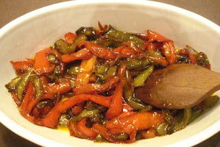 1 pimiento rojo, 1 pimiento verde, aceite, sal, vinagre de vino tinto, azúcar.