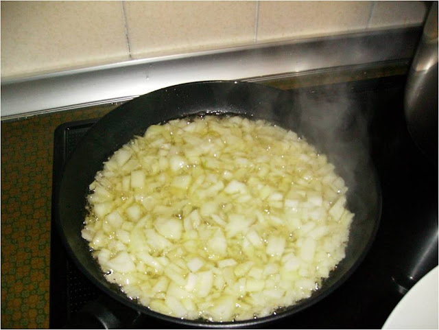 Dejamos las cebollas 3 o 4 minutos y echamos los pimientos, mezclamos bien, para que se frían.