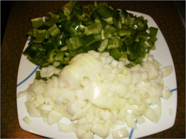 Lavamos los pimientos les quitamos las semillas y cortamos en pequeño y hacemos igual con la cebolla, para dejar todas las verduras del mismo tamaño.