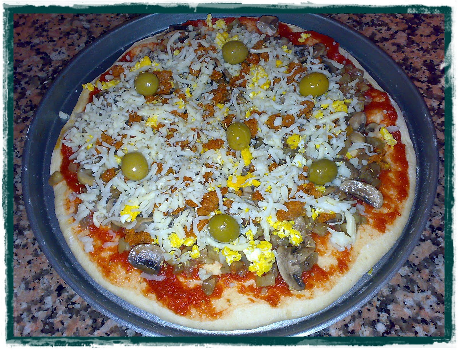 8.sacamos la base de pizza del horno y le hechamos el tomate,los ingredientes que sofreimos previamente,las aceitunas,el queso y el órégano