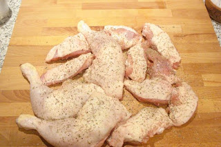 En una mesa de trabajo, disponer las piezas de pollo y sazonar con todas las especias, sal y pimienta.