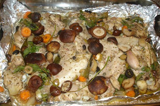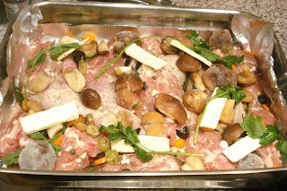 e incorporar aceitunas, perejil, las chalotas partidas por la mitad, los dientes de ajo enteros, las setas y al final distribuir un poco de mantequilla.