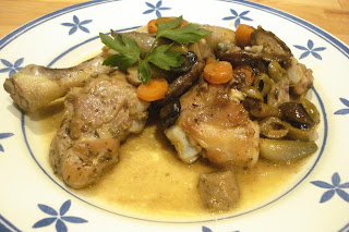 1,2 Kg. de pollo, 150 de setas, 1 zanahoria, 3 chalotas, 3 dientes de ajo, perejil, romero, tomillo, salvia, mejorana, pimienta, sal, aceite, mantequilla, aceitunas verdes y negras, vino blanco, harina.