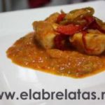 1 pollo cortado en trozos. 60 ml de aceite de oliva1 cebolla grande1/2 pimiento verde1/2 pimiento rojo2 dientes de ajo240 ml vino blanco150 gr. taquitos de jamón serrano1/2 cucharada de pimentón1/2 kg tomate frito1 ramita romero fresco(yo usé hierbas provenzales)1 hoja de laurel1/2 litro agua.Pimienta negra