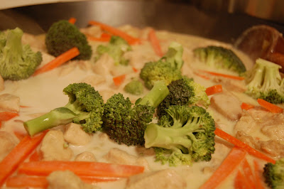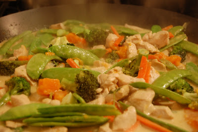 Todos los vegetales deben quedar crujientes. Así que nada debe cocinarse demasiado tiempo. A esto le agregas el pollo cortado en cubos y vuelves a revolver unos dos minutos, luego agregas crema de coco como para que cubra todos los ingredientes. Y unas dos cucharadas soperas de curry verde.