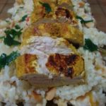 Cortamos las pechugas de pollo en tiras y las salamos. Machacamos los ajos y los mezclamos con el aceite, el zumo de limón, 1/2 cucharadita de pimentón, unas ramitas de romero y la pimienta negra molida. Metemos el pollo en este adobo y lo dejamos 1 hora en el frigorífico.