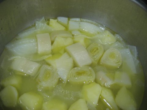 2. En una olla poner varias cucharadas de aceite de oliva. Sofreír los puerros, el diente de ajo y la cebolla durante unos minutos. Añadir la patata y el agua necesaria para cubrirla. Salar al gusto. Hervir.