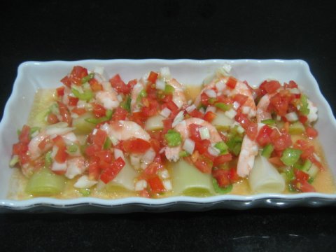 En una fuente poner puerros y langostinos, y aliñar con la vinagreta.