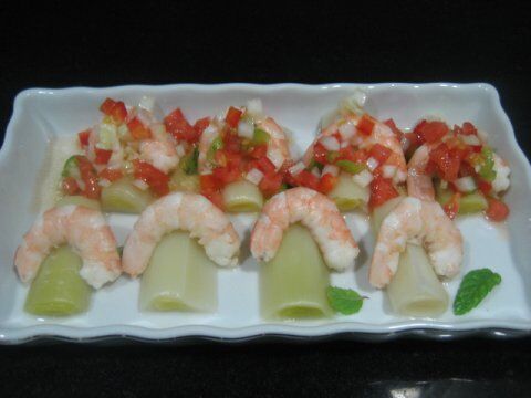 En una fuente poner puerros y langostinos, y aliñar con la vinagreta.
