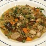 En una cazuela de barro, poner 4 cucharadas de aceite, el apio y el puerro picados y la zanahoria y la cebolla en rodajas.