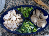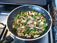 Añadir primero las puntas de espárragos con los ajos tiernos, setas y en último lugar los champiñones. Dejar que se hagan unos minutos, añadir el chorrito de whisky y cuando casi ya estaban añadí los dos huevos enteros y removí hasta que se cuajaron.
