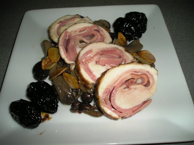 En una sartén se dora la pechuga por todos los lados, se aparta y en el mismo aceite ( poquito) es rehogan los ajos laminados las setas, las ciruelas y el vaso de Pedro Ximenez, se remueve y se incorpora el Rollo dejando que se haga lentamente hasta que la reducción quede al gusto, ( yo me quedé si Pedro X.), pero estaba muy rico también.