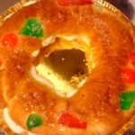 En otro recipiente se echa el resto de la harina, se le agrega la mantequilla, el azucar,y la raspadura de limón. Las pasas y los piñones se dejan macerar en el vino de Oporto la noche anterior para que tomen el sabor y  se esponjen bien. Se incorporan a la masa y se va sobando con las manos hasta que quede una masa bien  integrada y suabe. Una vez en su punto se forma un rosco grande con un agujero pequeño en el centro. Los huevos se baten  se mezclan con 2 cucharadas de agua y se pincela todo el rosco. Se le ponen las guindas de colores y se cuece a horno precalentado tres cuartos de hora, cuando está muy dorado y brillante se saca. Para terminar se espolvorea de azúcar glas.