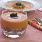 Vasitos de salmorejo de espárragos y huevo, con jamon