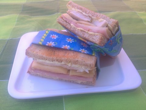 Sándwich de jamón york y queso con pepino, manzana y alioli.