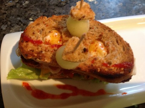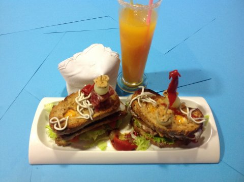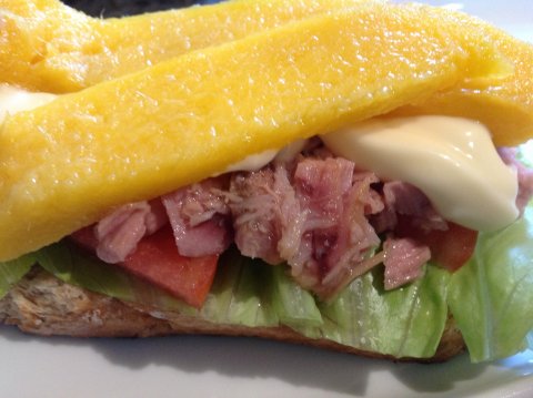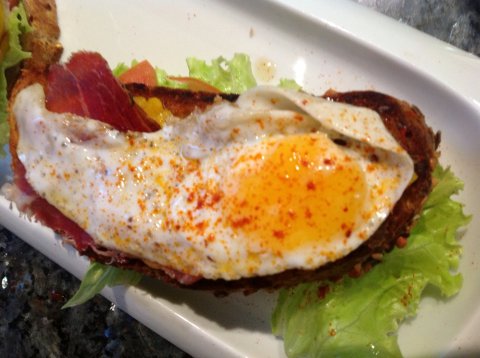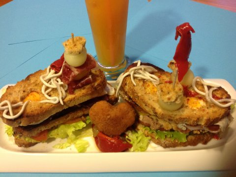 - Colocamos la lechuga, tomate, bonito y mahonesa. Colocamos otra rebanada de pan, unas lonchas de mango, de melón ,paleta ibérica y 2 huevos (de codorniz) a la plancha.