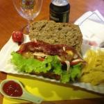 Sándwich de tomates verdes fritos, bacón, mozzarella, brotes de lechuga y salta tártara.