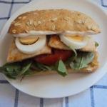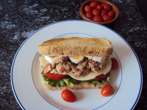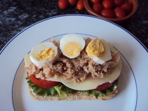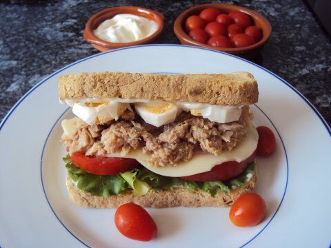 Sobre éstas colocamos la loncha de jamón cocido, las de queso, el atún previamente escurrido, las rodajas de huevo cocido y cerramos el sándwich con la otra rebanada de pan de molde mediterraneo untada en mayonesa.