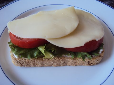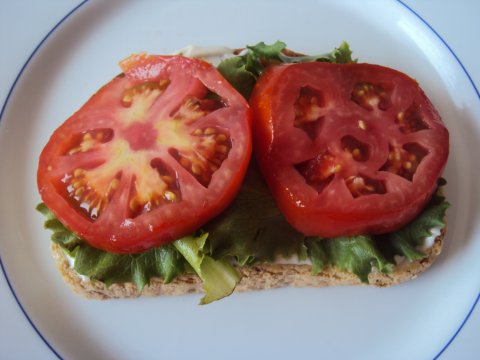 Untamos una rebanada del pan con mayonesa, encima colocamos las hojas de lechuga y dos rodajas de tomate.