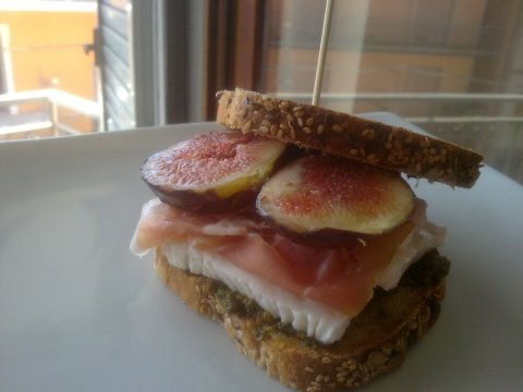 Luego una rodaja de queso, los higos cortados tambien en rodajas y por fin el jamon.