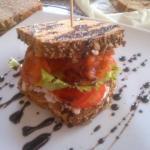 Sándwich de tomates verdes fritos, bacón, mozzarella, brotes de lechuga y salta tártara.