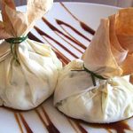 Presentación: Ponemos en cada plato un poco de salsa y un saquito, adornamos con unas hebras de azafrán y con cebollino.