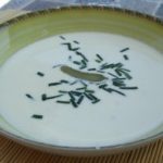 Mientras que se enfría la sopa pelamos las gambas. Servimos la sopa con cebollinos picados y en el centro unas gambas.
