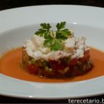 Sopa fría de pomelo y melocotón con vodka de caramelo y langostino marinado